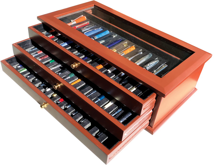Μια συλλογή από πένες είναι πολύ καλύτερη όταν έχει τη θήκη της! Η θήκη της συλλογής (χωρίς τις πένες) είναι ξύλινη, διαθέτει 3 συρτάρια που έχουν υποδοχές από απαλό υλικό, ενώ το πρώτο συρτάρι είναι και εκθετήριο, καθώς η πάνω πλευρά της θήκης είναι ένα ξύλινο πλαίσιο με γυαλί.